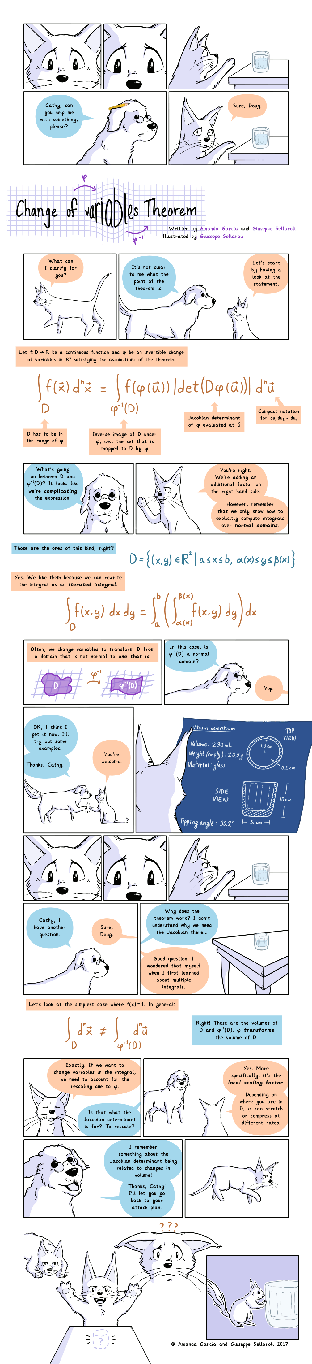 Each of these assumptions would take a comic (or two) to unpack, so we left them out of this comic for simplicity. Also, the point of this comic is not to provide a comprehensive explanation of the theorem, but to highlight why it’s useful and what the Jacobian determinant’s role is.