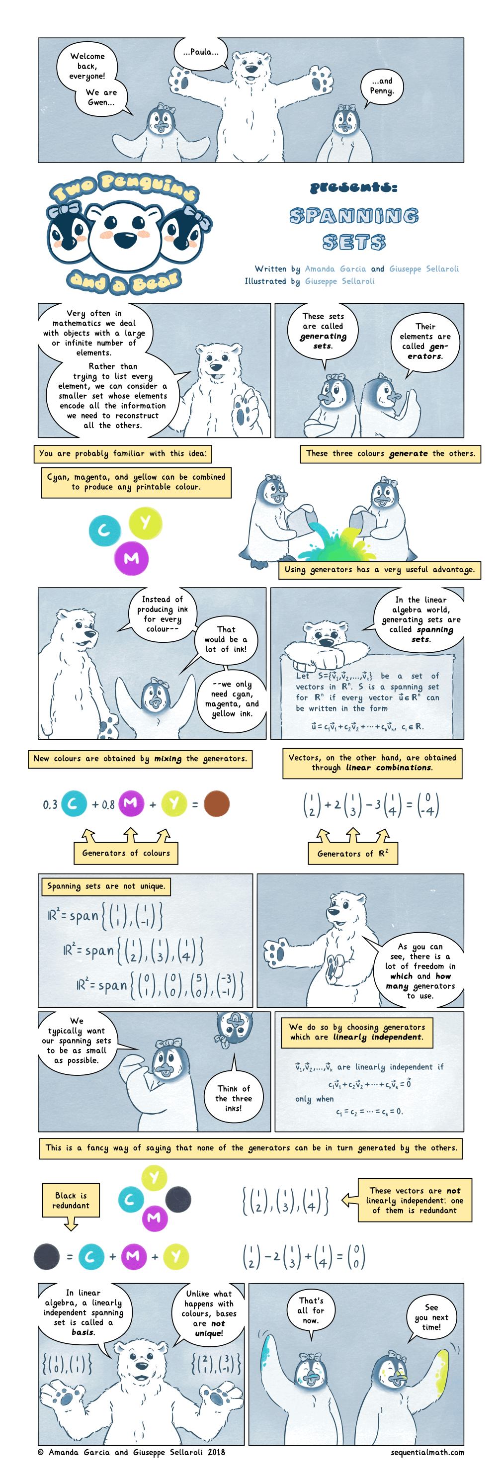 Most people first encounter spanning in linear algebra, where they are introduced on the way to defining bases. But spanning sets are important and interesting creatures in their own right! They are in fact a special type of generating set: these pop up in group theory, ring theory, topology, and more!